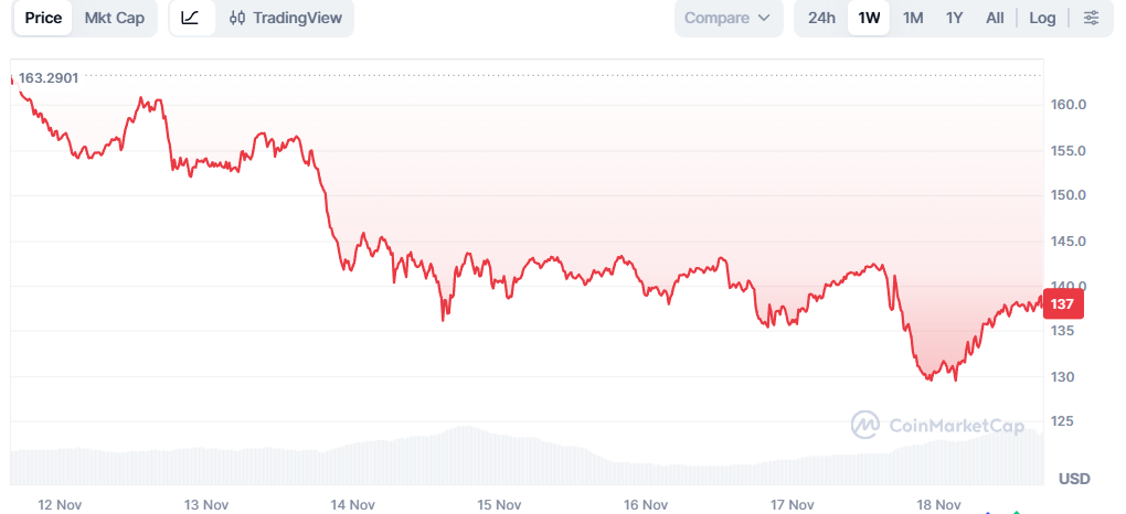 SOL’s 14-day relative strength index (RSI) dropped to 27.5, marking one of its most oversold readings of the quarter. The rebound was triggered as price reacted to the $127 Fibonacci support, an area that has historically served as a turning point during drawdowns.